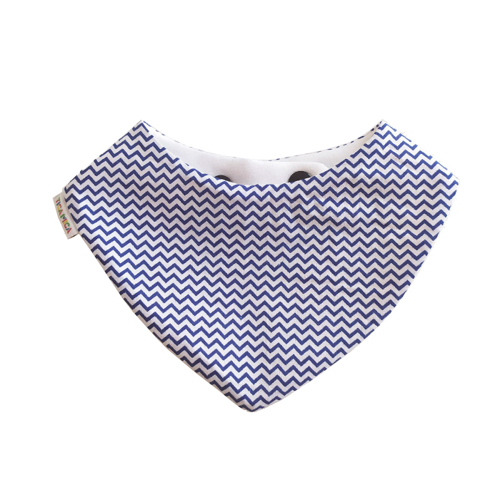 Estampado zigzag en blanco y azul, está realizado con tejido absorbente. Tiene forma de pico, 2 posiciones de ajuste en el cuello con botones tipo snap, adaptándose al crecimiento del niño. De tacto muy suave y agradable.