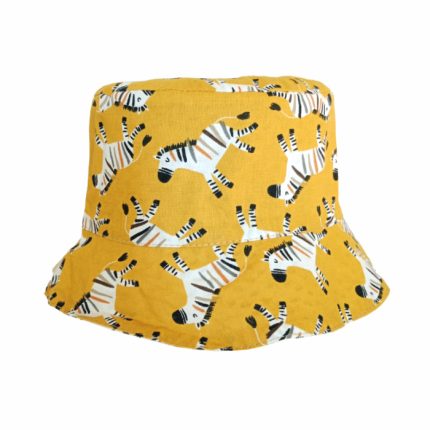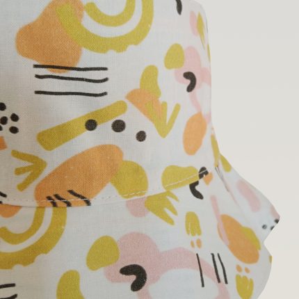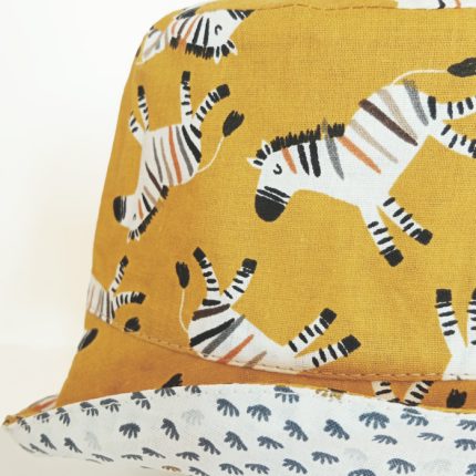 Gorro reversible de mofetas en azul por un lado y, geométrico blanco, azul y amarillo, por el otro. ¡Combina dos estilos en uno!
